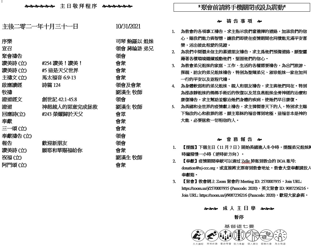 主日崇拜 10:00AM - 11:25 AM  ; 主日学 11:30AM - 12:30PM 青少年 10:00AM - 12:00PM ; 午餐 12:30M - 1:30PM 疫情時期教會的聚會实体和ZOOM网上同步举行, 歡迎新老朋友参加! https://zoom.us/j/2570007935 17 雖然無花果樹不發旺,葡萄樹不結果,橄欖樹也不效力,田地不出糧食,圈中絕了羊,棚內也沒有牛;18 然而,我要因耶和華歡欣,因救我的神喜樂。19 主耶和華是我的力量;他使我的腳快如母鹿的蹄,又使我穩行在高處。這歌交與伶長,用絲弦的樂器。 (哈巴谷書3:17-19)