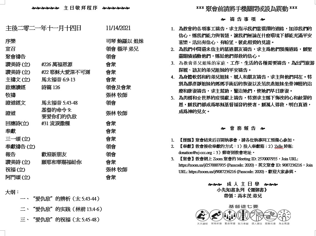 主日崇拜 10:00AM - 11:25 AM  ; 主日学 11:30AM - 12:30PM 青少年 10:00AM - 12:00PM ; 午餐 12:30M - 1:30PM 疫情時期教會的聚會实体和ZOOM网上同步举行, 歡迎新老朋友参加! https://zoom.us/j/2570007935 12 那時,撒拉鐵的兒子所羅巴伯和約撒答的兒子大祭司約書亞,並剩下的百姓,都聽從耶和華-他們神的話和先知哈該奉耶和華-他們神差來所說的話;百姓也在耶和華面前存敬畏的心。 13 耶和華的使者哈該奉耶和華差遣對百姓說:「耶和華說:我與你們同在。」 (哈該書1:12-13)