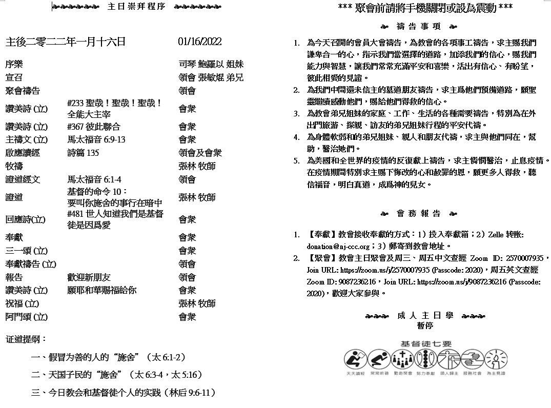 主日崇拜 10:00AM - 11:25 AM  ; 主日学 11:30AM - 12:30PM 青少年 10:00AM - 12:00PM ; 午餐 12:30M - 1:30PM 疫情時期教會的聚會实体和ZOOM网上同步举行, 歡迎新老朋友参加! https://zoom.us/j/2570007935 4 愛是恆久忍耐,又有恩慈;愛是不嫉妒;愛是不自誇,不張狂, 5 不做害羞的事,不求自己的益處,不輕易發怒,不計算人的惡, 6 不喜歡不義,只喜歡真理; 7 凡事包容,凡事相信,凡事盼望,凡事忍耐。8 愛是永不止息。 (哥林多前書13:4-8) |