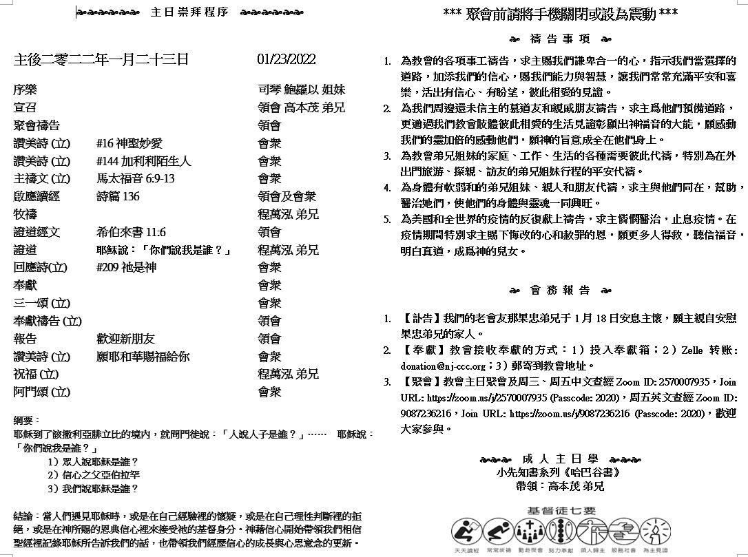 主日崇拜 10:00AM - 11:25 AM  ; 主日学 11:30AM - 12:30PM 青少年 10:00AM - 12:00PM ; 午餐 12:30M - 1:30PM 疫情時期教會的聚會实体和ZOOM网上同步举行, 歡迎新老朋友参加! https://zoom.us/j/2570007935 16 所以,我們不喪膽。外體雖然毀壞,內心卻一天新似一天。 17 我們這至暫至輕的苦楚,要為我們成就極重無比、永遠的榮耀。 18 原來我們不是顧念所見的,乃是顧念所不見的;因為所見的是暫時的,所不見的是永遠的。 (哥林多後書4:16-18) |