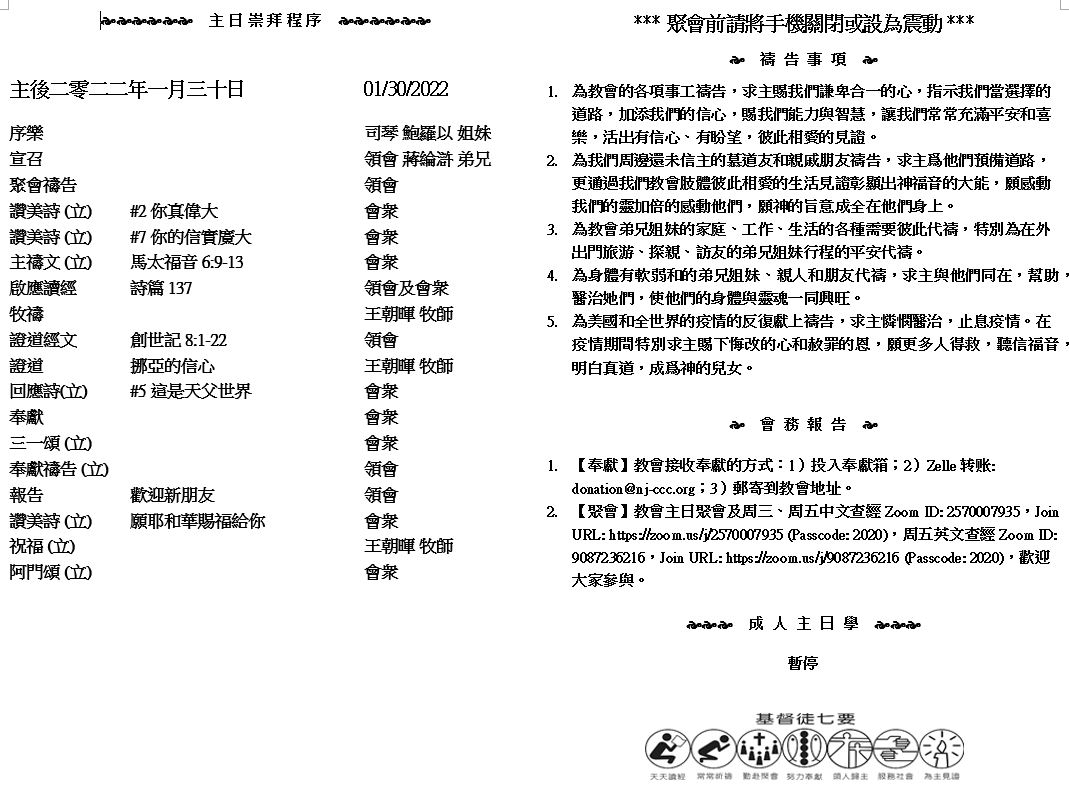 主日崇拜 10:00AM - 11:25 AM  ; 主日学 11:30AM - 12:30PM 青少年 10:00AM - 12:00PM ; 午餐 12:30M - 1:30PM 疫情時期教會的聚會实体和ZOOM网上同步举行, 歡迎新老朋友参加! https://zoom.us/j/2570007935 26 所以,你們因信基督耶穌都是神的兒子。 27 你們受洗歸入基督的都是披戴基督了。 28 並不分猶太人、希臘人,自主的、為奴的,或男或女,因為你們在基督耶穌裏都成為一了。 29 你們既屬乎基督,就是亞伯拉罕的後裔,是照着應許承受產業的了。 (加拉太書3:26-29) |
