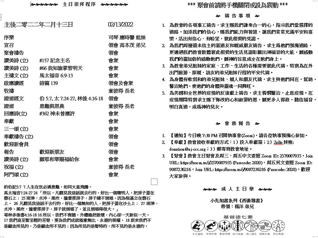 主日崇拜 10:00AM - 11:25 AM  ; 主日学 11:30AM - 12:30PM 青少年 10:00AM - 12:00PM ; 午餐 12:30M - 1:30PM 疫情時期教會的聚會实体和ZOOM网上同步举行, 歡迎新老朋友参加! https://zoom.us/j/2570007935 8 弟兄們,我還有未盡的話:凡是真實的、可敬的、公義的、清潔的、可愛的、有美名的,若有甚麼德行,若有甚麼稱讚,這些事你們都要思念。 9 你們在我身上所學習的,所領受的,所聽見的,所看見的,這些事你們都要去行,賜平安的神就必與你們同在。 (腓立比書4:8-9) |