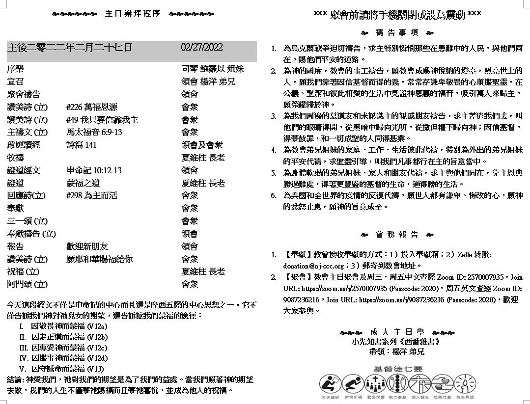 主日崇拜 10:00AM - 11:25 AM  ; 主日学 11:30AM - 12:30PM 青少年 10:00AM - 12:00PM ; 午餐 12:30M - 1:30PM 疫情時期教會的聚會实体和ZOOM网上同步举行, 歡迎新老朋友参加! https://zoom.us/j/2570007935 16 因為主必親自從天降臨,有呼叫的聲音和天使長的聲音,又有神的號吹響;那在基督裏死了的人必先復活。 17 以後我們這活着還存留的人必和他們一同被提到雲裏,在空中與主相遇。這樣,我們就要和主永遠同在。 18 所以,你們當用這些話彼此勸慰。 (帖撒羅尼迦前書4:16-18) |