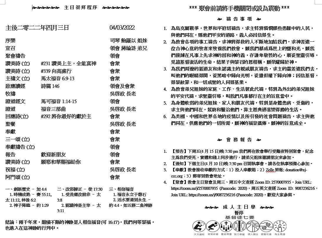 主日崇拜 10:00AM - 11:25 AM  ; 主日学 11:30AM - 12:30PM 青少年 10:00AM - 12:00PM ; 午餐 12:30M - 1:30PM 疫情時期教會的聚會实体和ZOOM网上同步举行, 歡迎新老朋友参加! https://zoom.us/j/2570007935 4 我禱告的時候提到你,常為你感謝我的神; 5 因聽說你的愛心並你向主耶穌和眾聖徒的信心。 6 願你與人所同有的信心顯出功效,使人知道你們各樣善事都是為基督做的。 7 兄弟啊,我為你的愛心,大有快樂,大得安慰,因眾聖徒的心從你得了暢快。 (腓利門書1:4-7) |