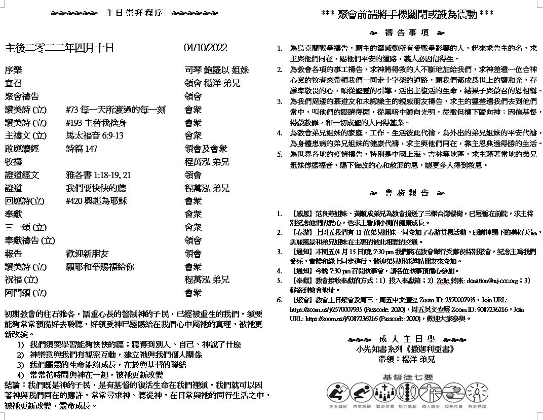 主日崇拜 10:00AM - 11:25 AM  ; 主日学 11:30AM - 12:30PM 青少年 10:00AM - 12:00PM ; 午餐 12:30M - 1:30PM 疫情時期教會的聚會实体和ZOOM网上同步举行, 歡迎新老朋友参加! https://zoom.us/j/2570007935 14 我們既然有一位已經升入高天尊榮的大祭司,就是神的兒子耶穌,便當持定所承認的道。 15 因我們的大祭司並非不能體恤我們的軟弱。他也曾凡事受過試探,與我們一樣,只是他沒有犯罪。 16 所以,我們只管坦然無懼地來到施恩的寶座前,為要得憐恤,蒙恩惠,作隨時的幫助。 (希伯來書4:14-16) |