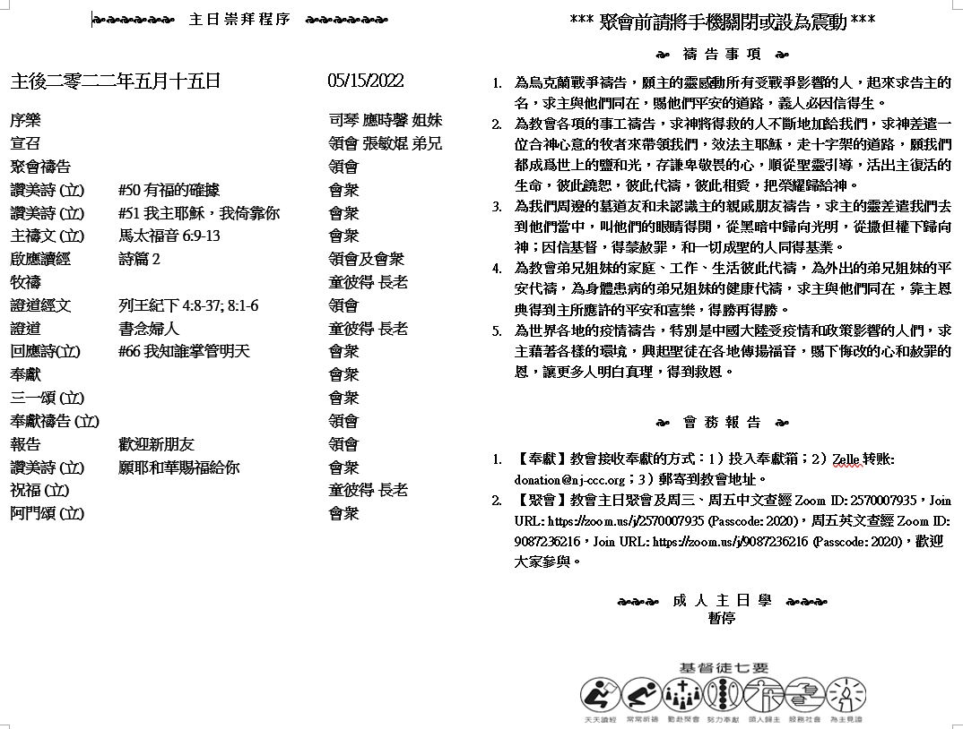 主日崇拜 10:00AM - 11:25 AM  ; 主日学 11:30AM - 12:30PM 青少年 10:00AM - 12:00PM ; 午餐 12:30M - 1:30PM 疫情時期教會的聚會实体和ZOOM网上同步举行, 歡迎新老朋友参加! https://zoom.us/j/2570007935 4 我見你的兒女,有照我們從父所受之命令遵行真理的,就甚歡喜。 5 太太啊,我現在勸你,我們大家要彼此相愛。這並不是我寫一條新命令給你,乃是我們從起初所受的命令。 6 我們若照他的命令行,這就是愛。你們從起初所聽見當行的,就是這命令。 (約翰二書1:4-6) |