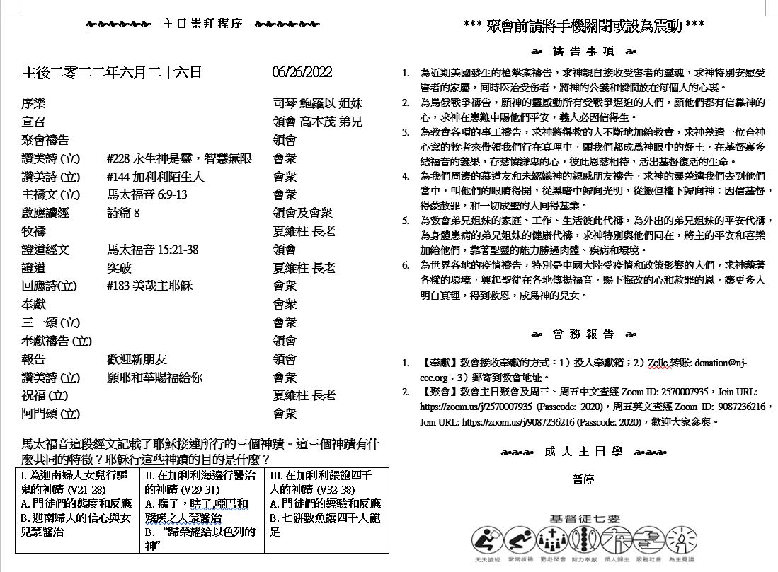 主日崇拜 10:00AM - 11:25 AM  ; 主日学 11:30AM - 12:30PM 青少年 10:00AM - 12:00PM ; 午餐 12:30M - 1:30PM 疫情時期教會的聚會实体和ZOOM网上同步举行, 歡迎新老朋友参加! https://zoom.us/j/2570007935 10 「我必將那施恩叫人懇求的靈,澆灌大衛家和耶路撒冷的居民。他們必仰望我(或譯:他;本節同),就是他們所扎的;必為我悲哀,如喪獨生子,又為我愁苦,如喪長子。 11 那日,耶路撒冷必有大大的悲哀,如米吉多平原之哈達臨門的悲哀。 (撒迦利亞書12:10-11) |