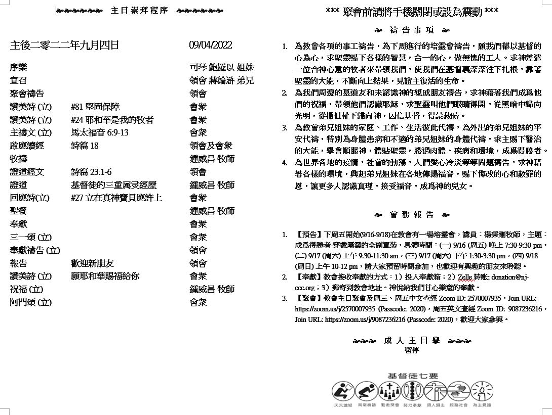 主日崇拜 10:00AM - 11:25 AM  ; 主日学 11:30AM - 12:30PM 青少年 10:00AM - 12:00PM ; 午餐 12:30M - 1:30PM 疫情時期教會的聚會实体和ZOOM网上同步举行, 歡迎新老朋友参加! https://zoom.us/j/2570007935 4 然而有一件事我要責備你,就是你把起初的愛心離棄了。 5 所以,應當回想你是從哪裏墜落的,並要悔改,行起初所行的事。你若不悔改,我就臨到你那裏,把你的燈臺從原處挪去。7 聖靈向眾教會所說的話,凡有耳的,就應當聽!得勝的,我必將神樂園中生命樹的果子賜給他吃。』」 (啟示錄2:4-5,7) |