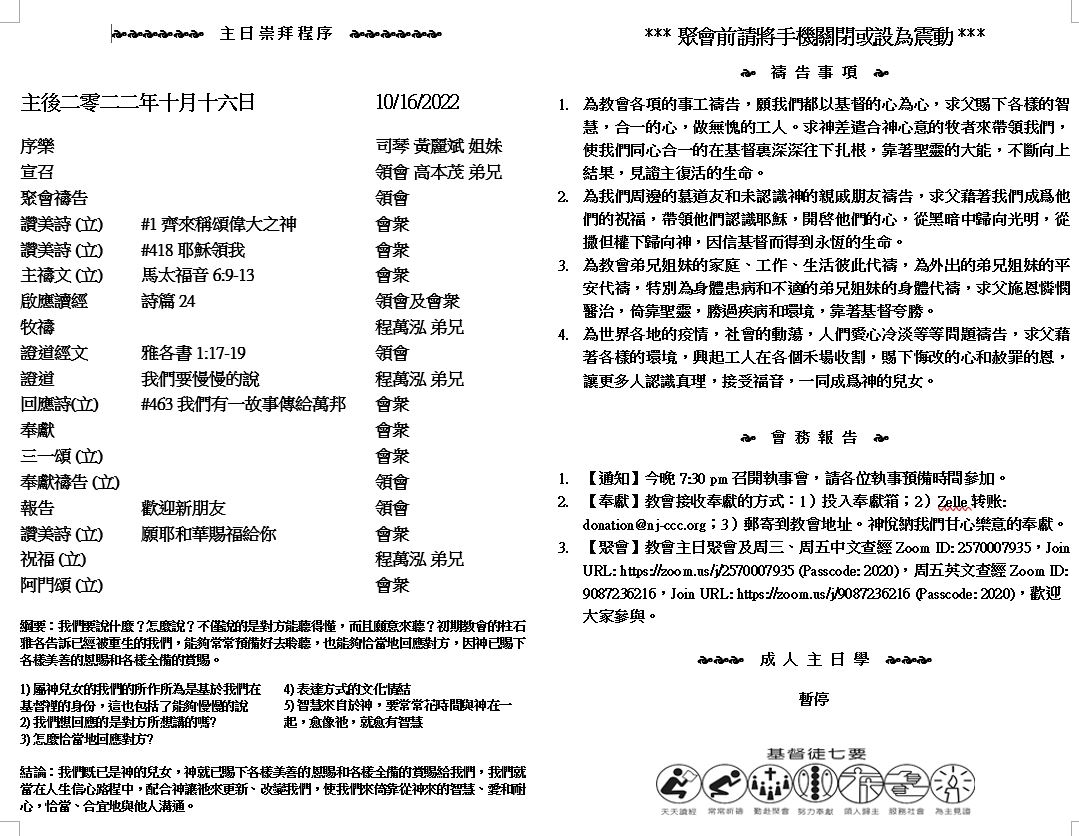 主日崇拜 10:00AM - 11:25 AM  ; 主日学 11:30AM - 12:30PM 青少年 10:00AM - 12:00PM ; 午餐 12:30M - 1:30PM 疫情時期教會的聚會实体和ZOOM网上同步举行, 歡迎新老朋友参加! https://zoom.us/j/2570007935 6 我又看見寶座與四活物,並長老之中有羔羊站立,像是被殺過的,有七角七眼,就是神的七靈,奉差遣往普天下去的。 7 這羔羊前來,從坐寶座的右手裏拿了書卷。 8 他既拿了書卷,四活物和二十四位長老就俯伏在羔羊面前,各拿着琴和盛滿了香的金爐;這香就是眾聖徒的祈禱。 (啟示錄5:6-8) |