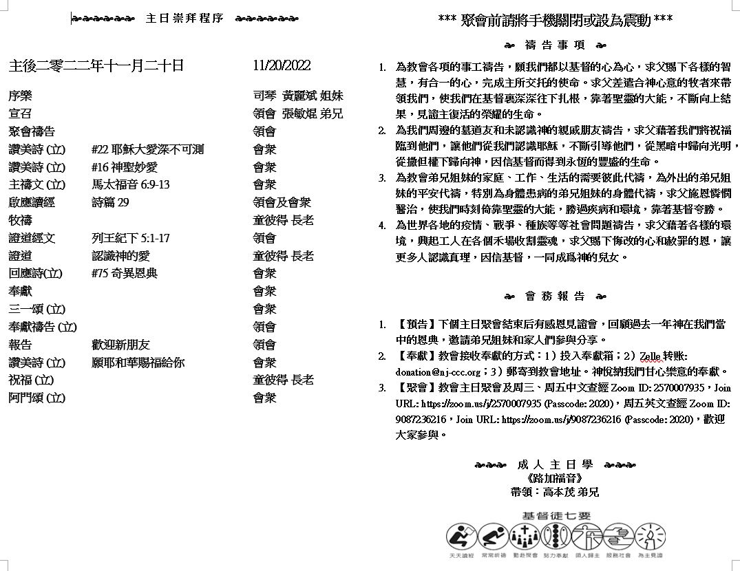 主日崇拜 10:00AM - 11:25 AM  ; 主日学 11:30AM - 12:30PM 青少年 10:00AM - 12:00PM ; 午餐 12:30M - 1:30PM 疫情時期教會的聚會实体和ZOOM网上同步举行, 歡迎新老朋友参加! https://zoom.us/j/2570007935 10 我聽見在天上有大聲音說:「我神的救恩、能力、國度,並他基督的權柄,現在都來到了!因為那在我們神面前晝夜控告我們弟兄的,已經被摔下去了。 11 弟兄勝過牠,是因羔羊的血和自己所見證的道。他們雖至於死,也不愛惜性命。 (啟示錄12:10-11) |