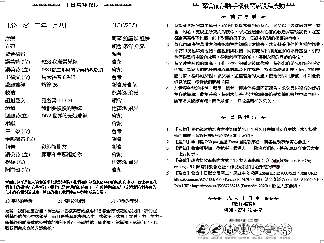 主日崇拜 10:00AM - 11:25 AM  ; 主日学 11:30AM - 12:30PM 青少年 10:00AM - 12:00PM ; 午餐 12:30M - 1:30PM 疫情時期教會的聚會实体和ZOOM网上同步举行, 歡迎新老朋友参加! https://zoom.us/j/2570007935 16 所以,我們不喪膽。外體雖然毀壞,內心卻一天新似一天。 17 我們這至暫至輕的苦楚,要為我們成就極重無比、永遠的榮耀。 18 原來我們不是顧念所見的,乃是顧念所不見的;因為所見的是暫時的,所不見的是永遠的。 (哥林多後書4:16-18)