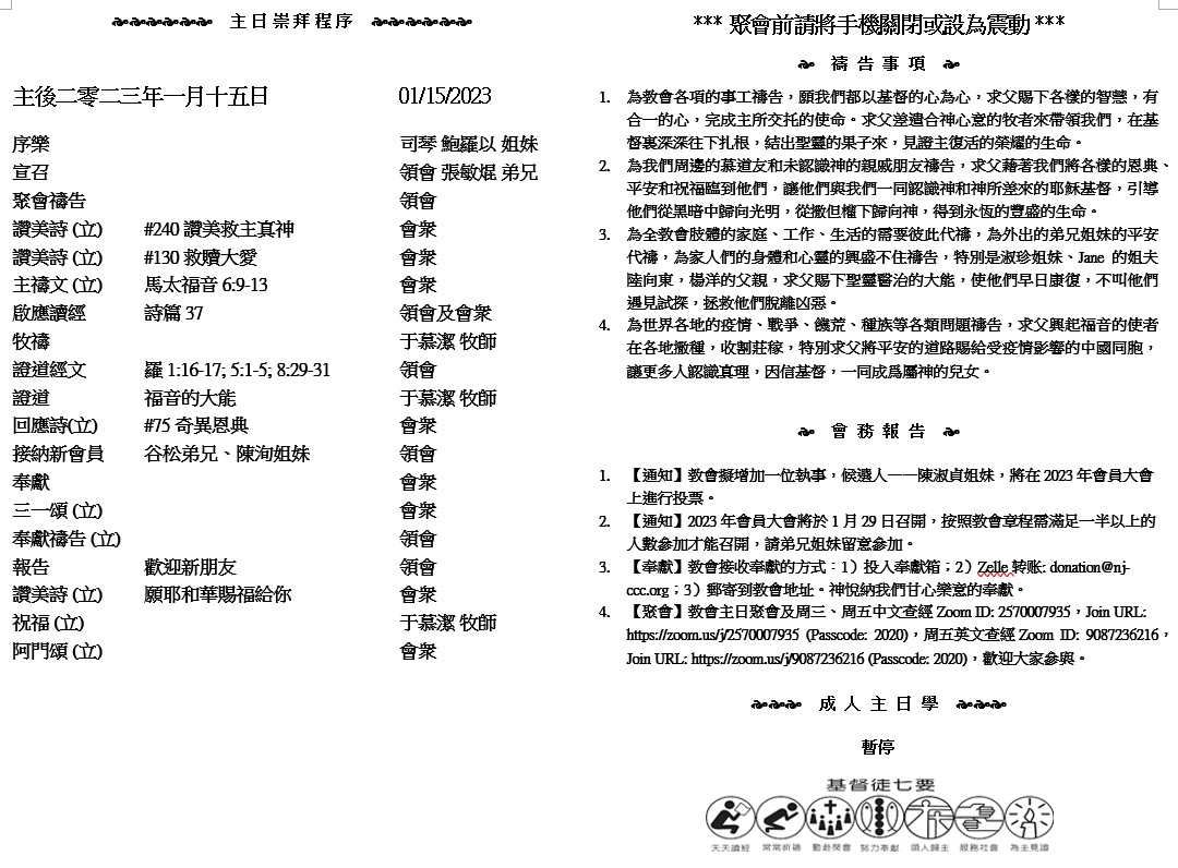 主日崇拜 10:00AM - 11:25 AM  ; 主日学 11:30AM - 12:30PM 青少年 10:00AM - 12:00PM ; 午餐 12:30M - 1:30PM 疫情時期教會的聚會实体和ZOOM网上同步举行, 歡迎新老朋友参加! https://zoom.us/j/2570007935 11 我觀看,見天開了。有一匹白馬,騎在馬上的稱為誠信真實,他審判,爭戰,都按着公義。 12 他的眼睛如火焰,他頭上戴着許多冠冕;又有寫着的名字,除了他自己沒有人知道。 13 他穿着濺了血的衣服;他的名稱為神之道。 (啟示錄19:11-13)
