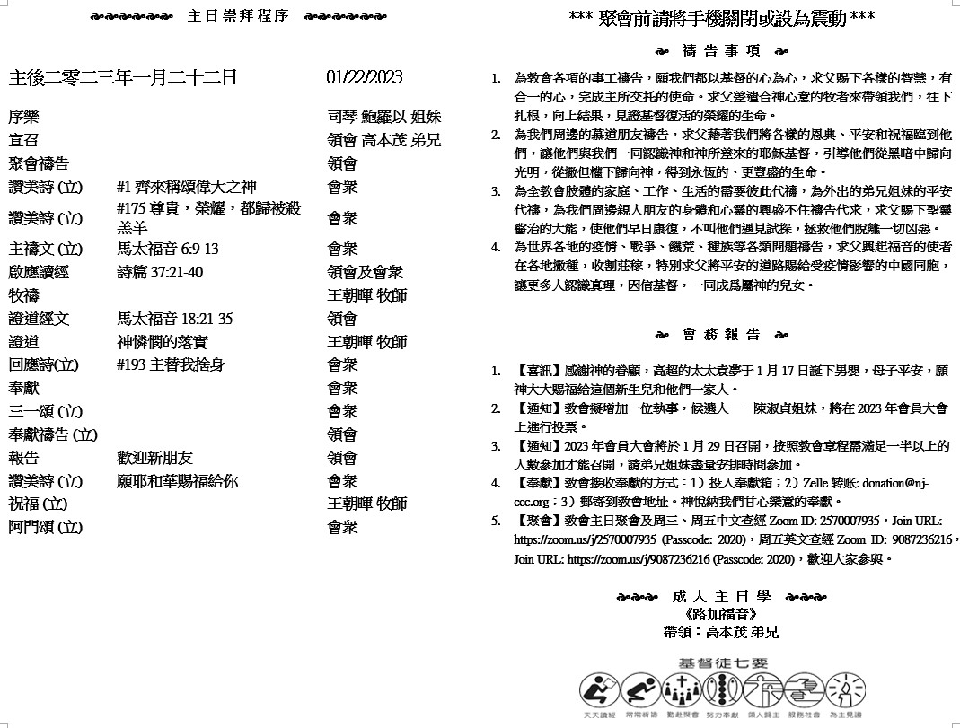 主日崇拜 10:00AM - 11:25 AM  ; 主日学 11:30AM - 12:30PM 青少年 10:00AM - 12:00PM ; 午餐 12:30M - 1:30PM 疫情時期教會的聚會实体和ZOOM网上同步举行, 歡迎新老朋友参加! https://zoom.us/j/2570007935 1 我又看見一個新天新地;因為先前的天地已經過去了,海也不再有了。 2 我又看見聖城新耶路撒冷由神那裏從天而降,預備好了,就如新婦妝飾整齊,等候丈夫。 3 我聽見有大聲音從寶座出來說:「看哪,神的帳幕在人間。他要與人同住,他們要作他的子民。神要親自與他們同在,作他們的神。 (啟示錄21:1-3)