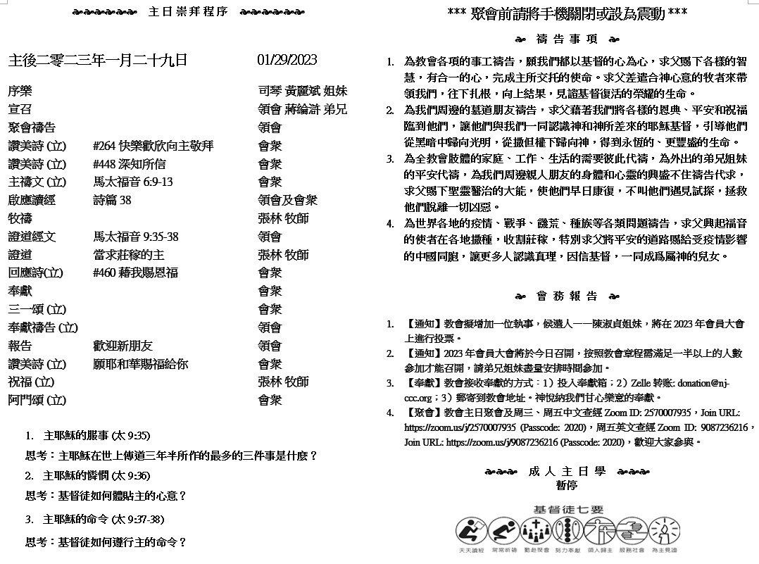 主日崇拜 10:00AM - 11:25 AM  ; 主日学 11:30AM - 12:30PM 青少年 10:00AM - 12:00PM ; 午餐 12:30M - 1:30PM 疫情時期教會的聚會实体和ZOOM网上同步举行, 歡迎新老朋友参加! https://zoom.us/j/2570007935 12 「看哪,我必快來!賞罰在我,要照各人所行的報應他。 13 我是阿拉法,我是俄梅戛;我是首先的,我是末後的;我是初,我是終。」14 那些洗淨自己衣服的有福了!可得權柄能到生命樹那裏,也能從門進城。 (啟示錄22:12-14)