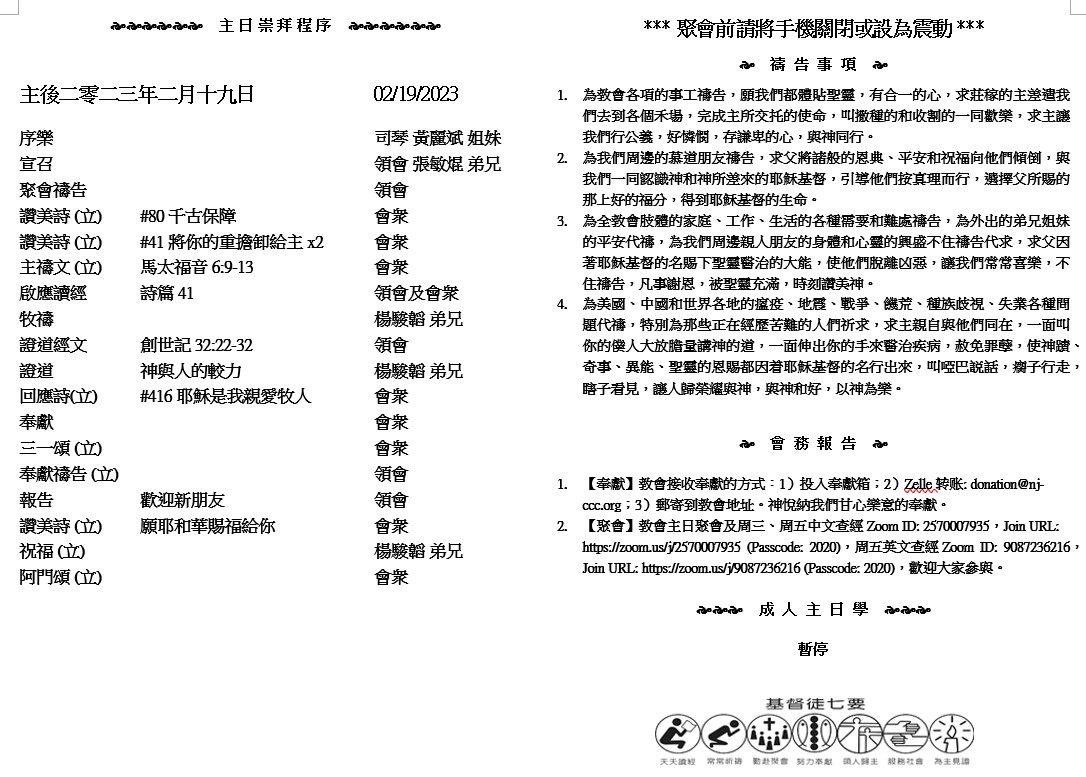 主日崇拜 10:00AM - 11:25 AM  ; 主日学 11:30AM - 12:30PM 青少年 10:00AM - 12:00PM ; 午餐 12:30M - 1:30PM 疫情時期教會的聚會实体和ZOOM网上同步举行, 歡迎新老朋友参加! https://zoom.us/j/2570007935 2 你們要恆切禱告,在此警醒感恩。 3 也要為我們禱告,求神給我們開傳道的門,能以講基督的奧祕(我為此被捆鎖), 4 叫我按着所該說的話將這奧祕發明出來。 5 你們要愛惜光陰,用智慧與外人交往。 6 你們的言語要常常帶着和氣,好像用鹽調和,就可知道該怎樣回答各人。 (歌羅西書4:2-6)