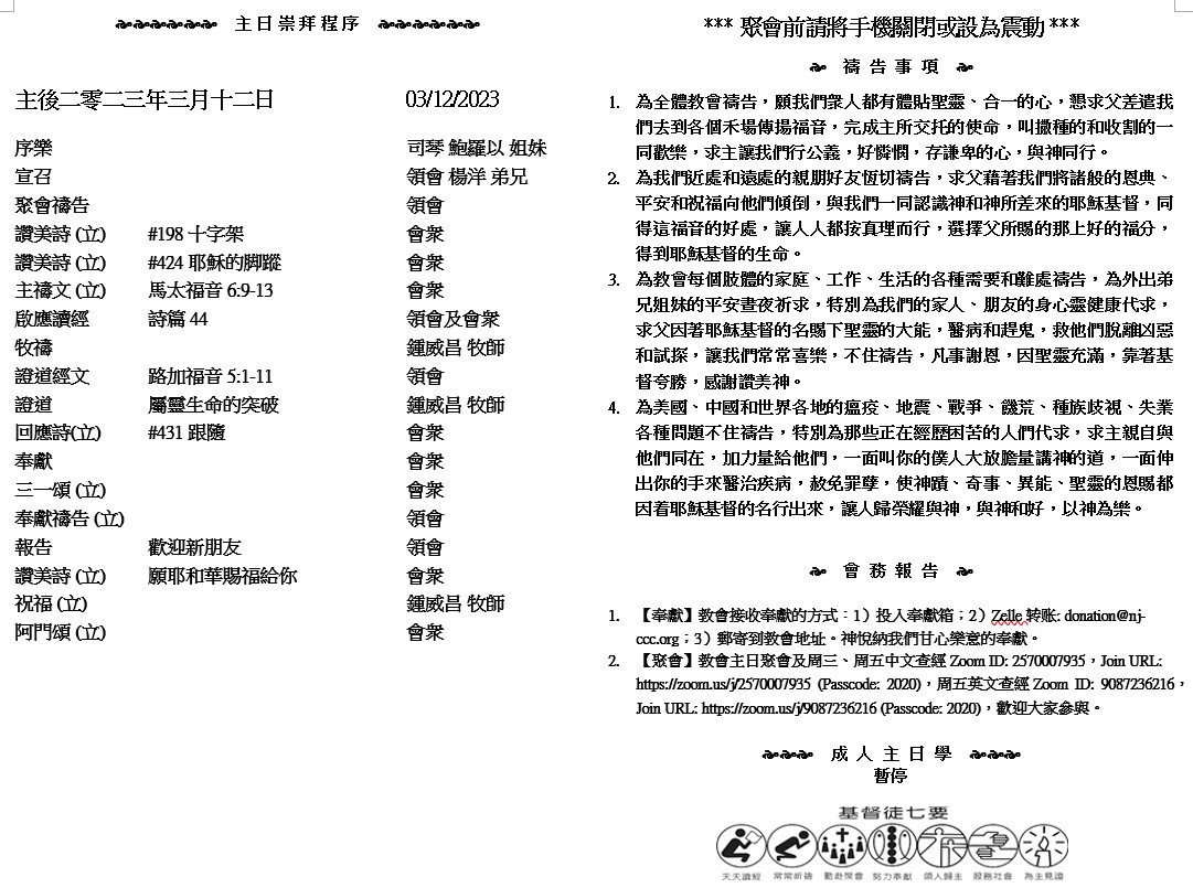 主日崇拜 10:00AM - 11:25 AM  ; 主日学 11:30AM - 12:30PM 青少年 10:00AM - 12:00PM ; 午餐 12:30M - 1:30PM 疫情時期教會的聚會实体和ZOOM网上同步举行, 歡迎新老朋友参加! https://zoom.us/j/2570007935 4 我往哪裏去,你們知道;那條路,你們也知道(有古卷:我往哪裏去,你們知道那條路)。」 5 多馬對他說:「主啊,我們不知道你往哪裏去,怎麼知道那條路呢?」 6 耶穌說:「我就是道路、真理、生命;若不藉着我,沒有人能到父那裏去。 7 你們若認識我,也就認識我的父。從今以後,你們認識他,並且已經看見他。」 ( 約翰福音14:4-7 )