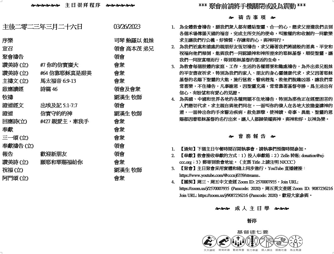 主日崇拜 10:00AM - 11:25 AM  ; 主日学 11:30AM - 12:30PM 青少年 10:00AM - 12:00PM ; 午餐 12:30M - 1:30PM 疫情時期教會的聚會实体和ZOOM网上同步举行, 歡迎新老朋友参加! https://zoom.us/j/2570007935 8 耶和華-你的神是應當稱頌的!他喜悅你,使你坐他的國位,為耶和華-你的神作王;因為你的神愛以色列人,要永遠堅立他們,所以立你作他們的王,使你秉公行義。」 ( 歷代志下9:8 )