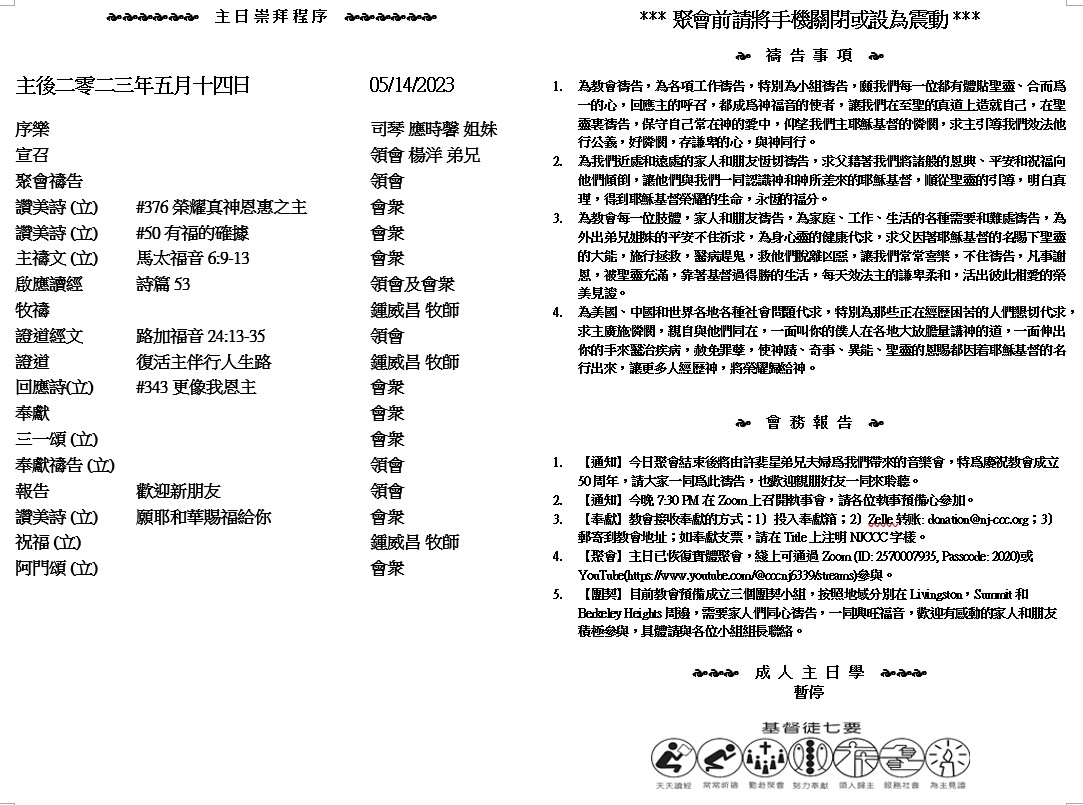 主日崇拜 10:00AM - 11:25 AM  ; 主日学 11:30AM - 12:30PM 青少年 10:00AM - 12:00PM ; 午餐 12:30M - 1:30PM 疫情時期教會的聚會实体和ZOOM网上同步举行, 歡迎新老朋友参加! https://zoom.us/j/2570007935 1 你們要稱謝耶和華,因他本為善;他的慈愛永遠長存!2 願以色列說: 他的慈愛永遠長存!3 願亞倫的家說:他的慈愛永遠長存!4 願敬畏耶和華的說:他的慈愛永遠長存! ( 詩篇118:1-4 )