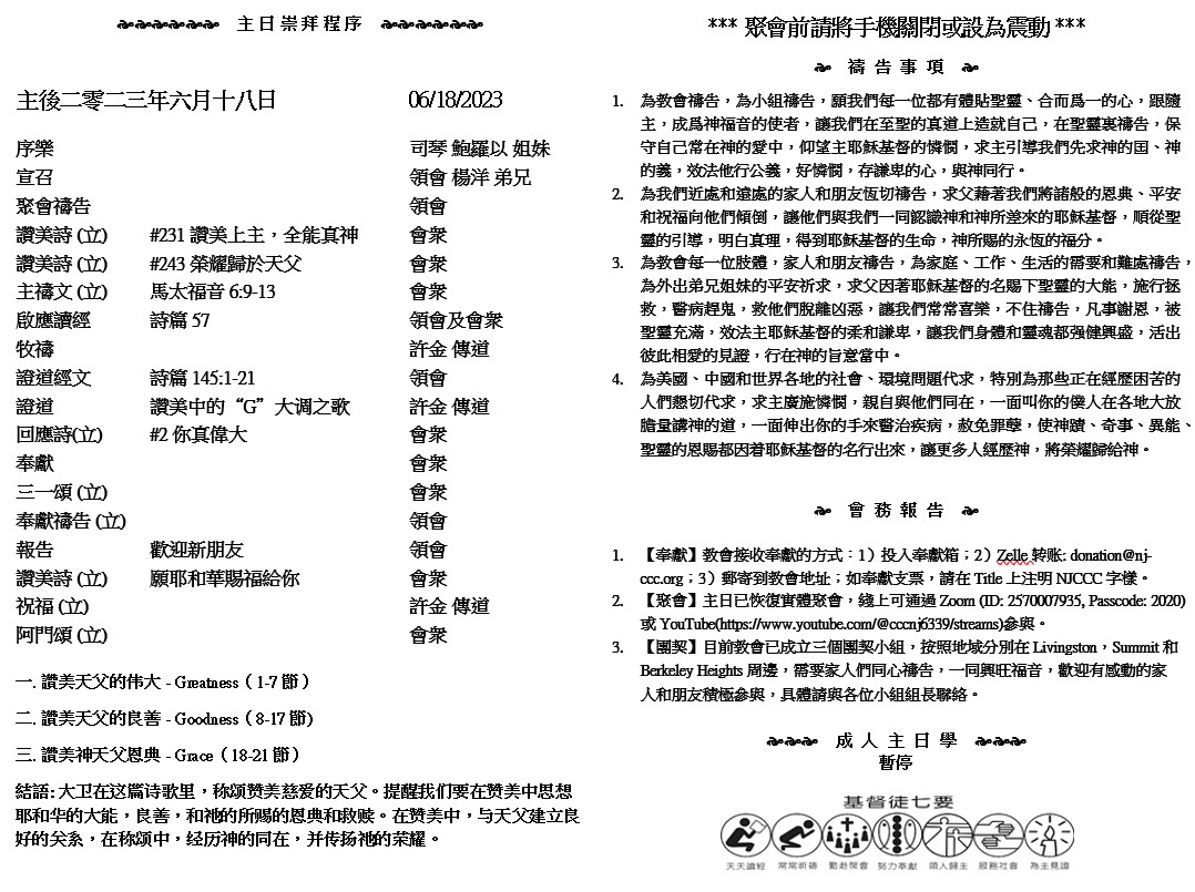 主日崇拜 10:00AM - 11:25 AM  ; 主日学 11:30AM - 12:30PM 青少年 10:00AM - 12:00PM ; 午餐 12:30M - 1:30PM 疫情時期教會的聚會实体和ZOOM网上同步举行, 歡迎新老朋友参加! https://zoom.us/j/2570007935 3 我觀看你指頭所造的天,並你所陳設的月亮星宿,4 便說:人算甚麼,你竟顧念他!世人算甚麼,你竟眷顧他!5 你叫他比天使(或譯:神)微小一點,並賜他榮耀尊貴為冠冕。6-8 你派他管理你手所造的,使萬物,就是一切的牛羊、田野的獸、空中的鳥、海裏的魚,凡經行海道的,都服在他的腳下。9 耶和華-我們的主啊,你的名在全地何其美! ( 詩篇8:3-9 )