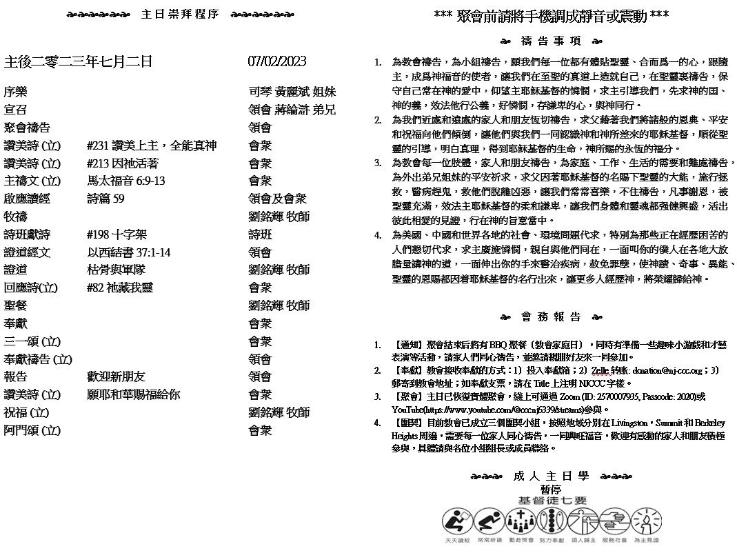 主日崇拜 10:00AM - 11:25 AM  ; 主日学 11:30AM - 12:30PM 青少年 10:00AM - 12:00PM ; 午餐 12:30M - 1:30PM 疫情時期教會的聚會实体和ZOOM网上同步举行, 歡迎新老朋友参加! https://zoom.us/j/2570007935 10 為義受逼迫的人有福了!因為天國是他們的。11 「人若因我辱罵你們,逼迫你們,捏造各樣壞話毀謗你們,你們就有福了! 12 應當歡喜快樂,因為你們在天上的賞賜是大的。在你們以前的先知,人也是這樣逼迫他們。」 ( 馬太福音5:10-12 )