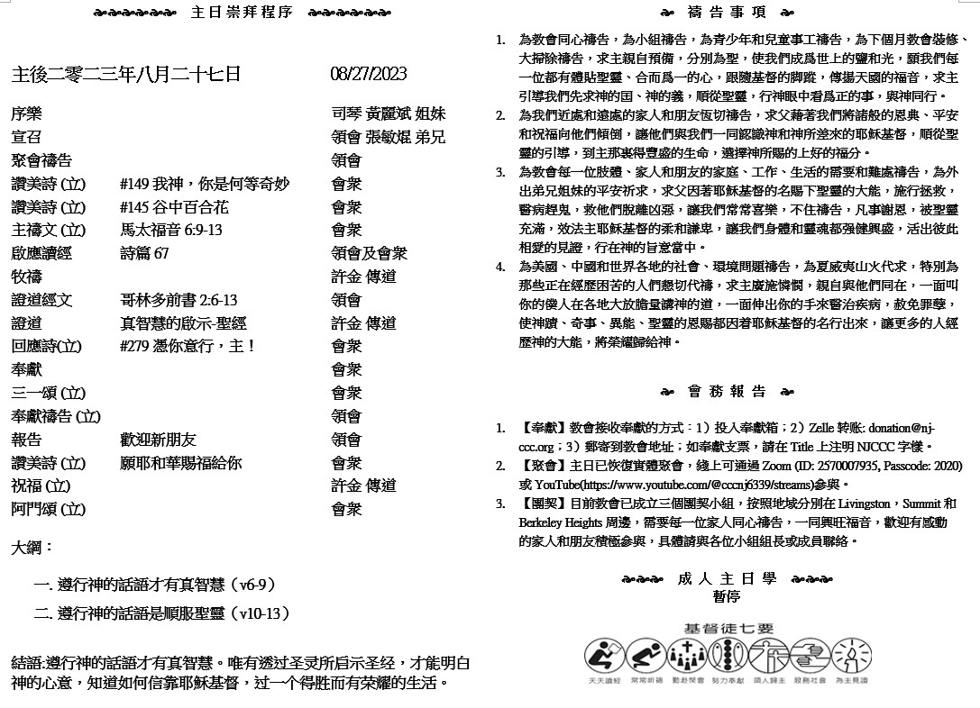 主日崇拜 10:00AM - 11:25 AM  ; 主日学 11:30AM - 12:30PM 青少年 10:00AM - 12:00PM ; 午餐 12:30M - 1:30PM 疫情時期教會的聚會实体和ZOOM网上同步举行, 歡迎新老朋友参加! https://zoom.us/j/2570007935 12 「我還有好些事要告訴你們,但你們現在擔當不了(或譯:不能領會)。 13 只等真理的聖靈來了,他要引導你們明白(原文是進入)一切的真理;因為他不是憑自己說的,乃是把他所聽見的都說出來,並要把將來的事告訴你們。 14 他要榮耀我,因為他要將受於我的告訴你們。 ( 約翰福音16:12-14 )