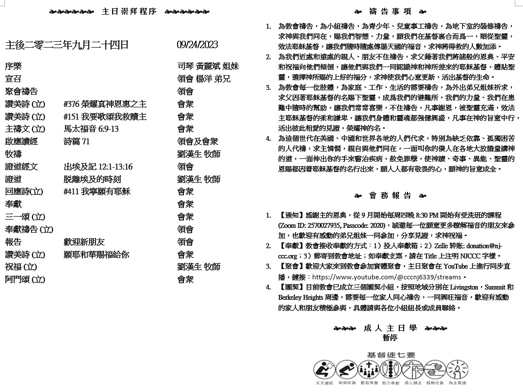 主日崇拜 10:00AM - 11:25 AM  ; 主日学 11:30AM - 12:30PM 青少年 10:00AM - 12:00PM ; 午餐 12:30M - 1:30PM 疫情時期教會的聚會实体和ZOOM网上同步举行, 歡迎新老朋友参加! https://zoom.us/j/2570007935 1 弟兄們,我還有話說:請你們為我們禱告,好叫主的道理快快行開,得着榮耀,正如在你們中間一樣, 2 也叫我們脫離無理之惡人的手;因為人不都是有信心。 3 但主是信實的,要堅固你們,保護你們脫離那惡者(或譯:脫離凶惡)。 4 我們靠主深信,你們現在是遵行我們所吩咐的,後來也必要遵行。 5 願主引導你們的心,叫你們愛神,並學基督的忍耐! ( 帖撒羅尼迦後書3:1-5 )