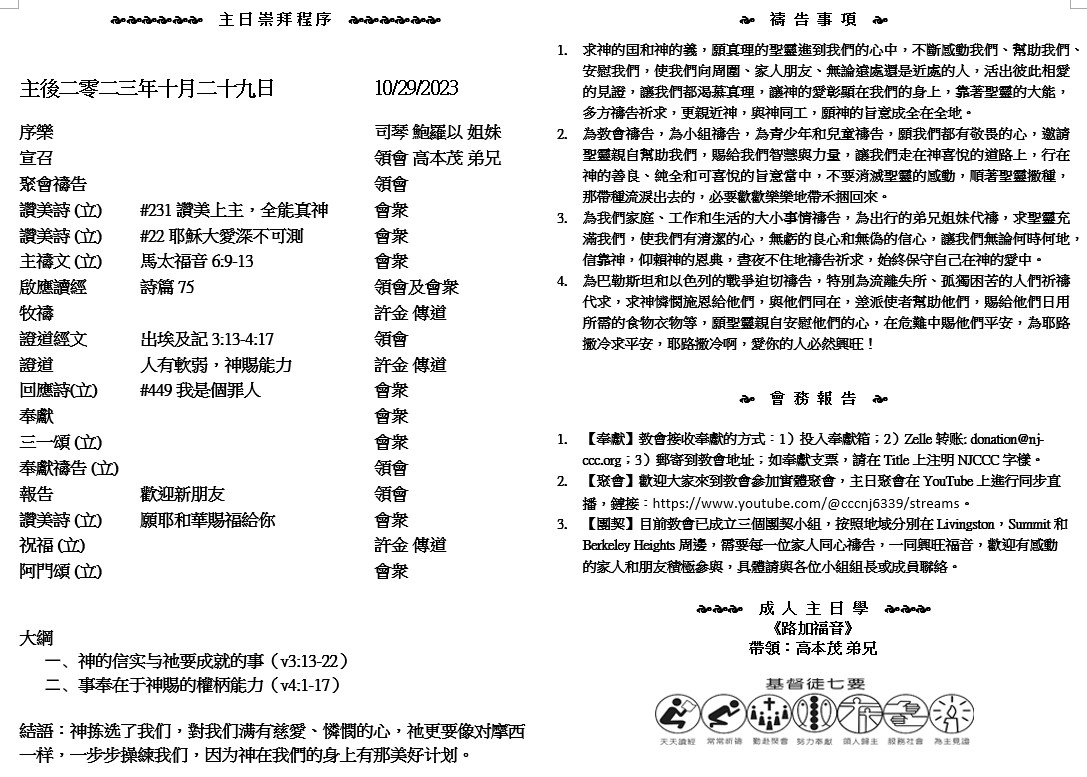 主日崇拜 10:00AM - 11:25 AM  ; 主日学 11:30AM - 12:30PM 青少年 10:00AM - 12:00PM ; 午餐 12:30M - 1:30PM 疫情時期教會的聚會实体和ZOOM网上同步举行, 歡迎新老朋友参加! https://zoom.us/j/2570007935 1 我若能說萬人的方言,並天使的話語,卻沒有愛,我就成了鳴的鑼,響的鈸一般。 2 我若有先知講道之能,也明白各樣的奧祕,各樣的知識,而且有全備的信,叫我能夠移山,卻沒有愛,我就算不得甚麼。 3 我若將所有的賙濟窮人,又捨己身叫人焚燒,卻沒有愛,仍然與我無益。 ( 哥林多前書13:1-3 )