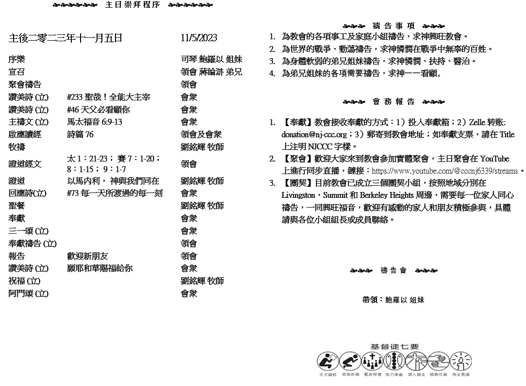 主日崇拜 10:00AM - 11:25 AM  ; 主日学 11:30AM - 12:30PM 青少年 10:00AM - 12:00PM ; 午餐 12:30M - 1:30PM 疫情時期教會的聚會实体和ZOOM网上同步举行, 歡迎新老朋友参加! https://zoom.us/j/2570007935 因 有 一 嬰 孩 為 我 們 而 生 、 有 一 子 賜 給 我 們 . 政 權 必 擔 在 他 的 肩 頭 上 . 他 名 稱 為 奇 妙 、 策 士 、 全 能 的 神 、 永 在 的 父 、 和 平 的 君 。 ( 以 賽 亞 書 9:6 )