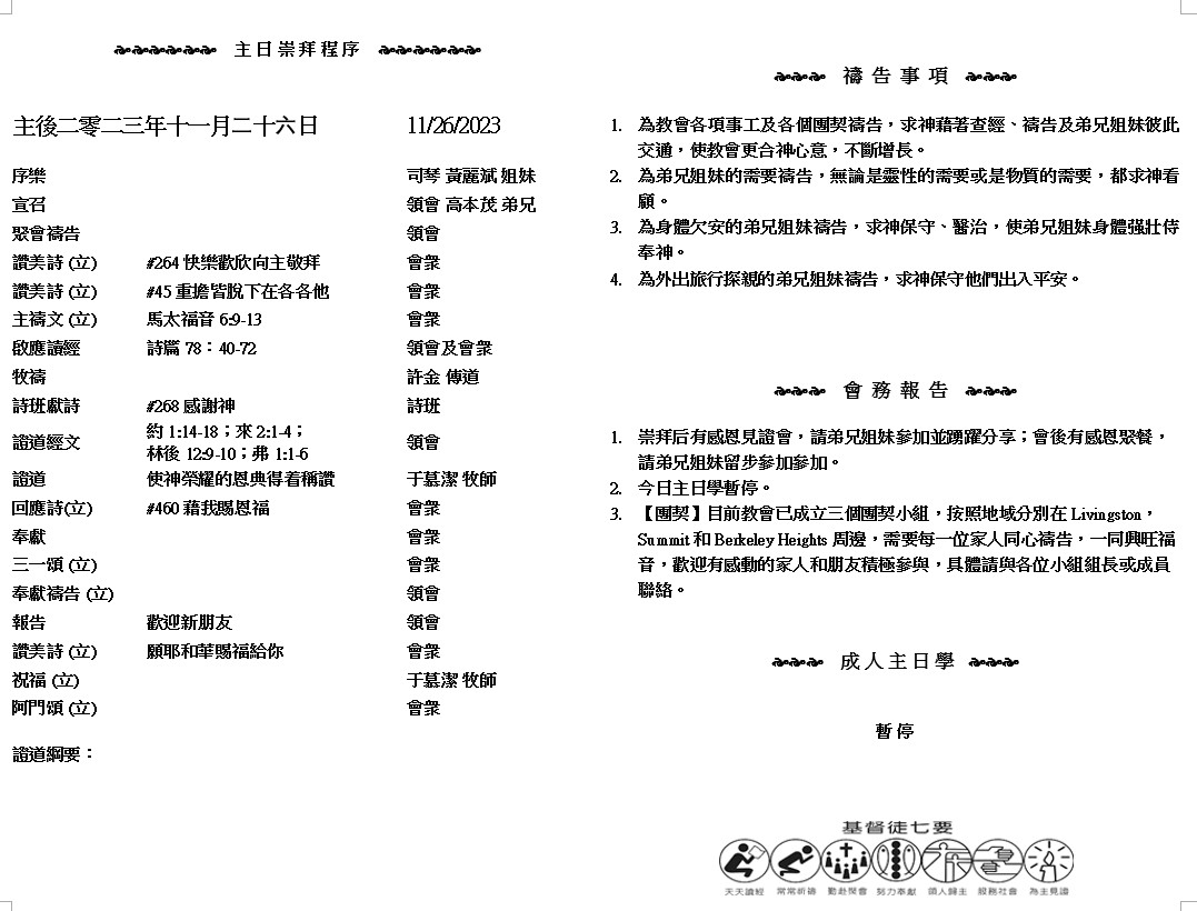 主日崇拜 10:00AM - 11:25 AM  ; 主日学 11:30AM - 12:30PM 青少年 10:00AM - 12:00PM ; 午餐 12:30M - 1:30PM 疫情時期教會的聚會实体和ZOOM网上同步举行, 歡迎新老朋友参加! https://zoom.us/j/2570007935 他 對 我 說 、 我 的 恩 典 夠 你 用 的 . 因 為 我 的 能 力 、 是 在 人 的 軟 弱 上 顯 得 完 全 . 所 以 我 更 喜 歡 誇 自 己 的 軟 弱 、 好 叫 基 督 的 能 力 覆 庇 我 . ( 哥 林 多 後 書 2:9 )