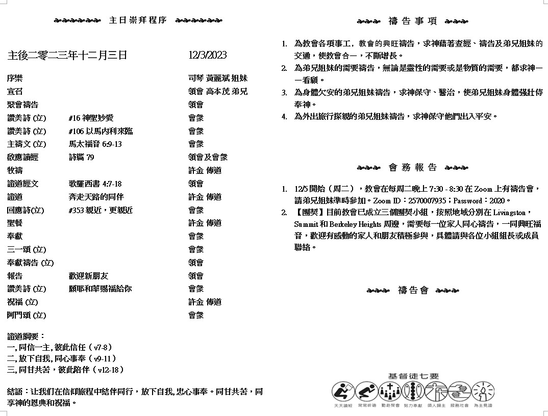 主日崇拜 10:00AM - 11:25 AM  ; 主日学 11:30AM - 12:30PM 青少年 10:00AM - 12:00PM ; 午餐 12:30M - 1:30PM 疫情時期教會的聚會实体和ZOOM网上同步举行, 歡迎新老朋友参加! https://zoom.us/j/2570007935 願 你 們 在 神 一 切 的 旨 意 上 、 得 以 完 全 、 信 心 充 足 、 能 站 立 得 穩 。 ( 歌羅西書4:12 )