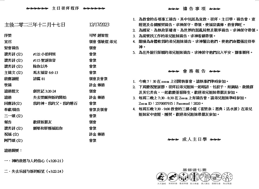 主日崇拜 10:00AM - 11:25 AM  ; 主日学 11:30AM - 12:30PM 青少年 10:00AM - 12:00PM ; 午餐 12:30M - 1:30PM 疫情時期教會的聚會实体和ZOOM网上同步举行, 歡迎新老朋友参加! https://zoom.us/j/2570007935 甚 願 我 的 民 肯 聽 從 我 、 以 色 列 肯 行 我 的 道 .我 便 速 速 治 服 他 們 的 仇 敵 、 反 手 攻 擊 他 們 的 敵 人 。 ( 詩篇81:13-14 )