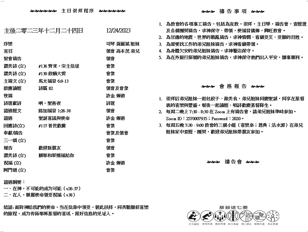 主日崇拜 10:00AM - 11:25 AM  ; 主日学 11:30AM - 12:30PM 青少年 10:00AM - 12:00PM ; 午餐 12:30M - 1:30PM 疫情時期教會的聚會实体和ZOOM网上同步举行, 歡迎新老朋友参加! https://zoom.us/j/2570007935 在 至 高 之 處 榮 耀 歸 與 神 、 在 地 上 平 安 歸 與 他 所 喜 悅 的 人 。 (路加福音2:14)