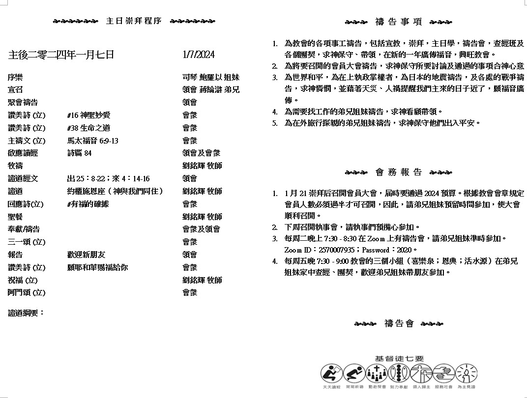 主日崇拜 10:00AM - 11:25 AM  ; 主日学 11:30AM - 12:30PM 青少年 10:00AM - 12:00PM ; 午餐 12:30M - 1:30PM 疫情時期教會的聚會实体和ZOOM网上同步举行, 歡迎新老朋友参加! https://zoom.us/j/2570007935 所 以 我 們 只 管 坦 然 無 懼 的 、 來 到 施 恩 的 寶 座 前 、 為 要 得 憐 恤 、 蒙 恩 惠 作 隨 時 的 幫 助 。 ( 希 伯 來 書4:16 )