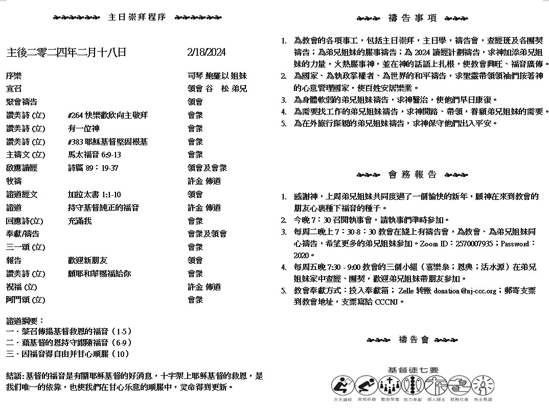 主日崇拜 10:00AM - 11:25 AM  ; 主日学 11:30AM - 12:30PM 青少年 10:00AM - 12:00PM ; 午餐 12:30M - 1:30PM 疫情時期教會的聚會实体和ZOOM网上同步举行, 歡迎新老朋友参加! https://zoom.us/j/2570007935 我 現 在 是 要 得 人 的 心 呢 、 還 是 要 得 神 的 心 呢 . 我 豈 是 討 人 的 喜 歡 麼 . 若 仍 舊 討 人 的 喜 歡 、 我 就 不 是 基 督 的 僕 人 了 。 ( 加 拉 太 書1:10 )