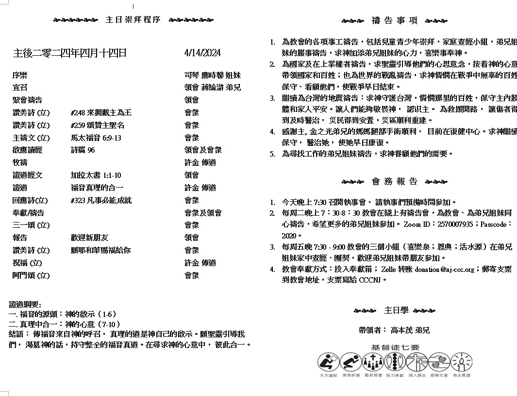 主日崇拜 10:00AM - 11:25 AM  ; 主日学 11:30AM - 12:30PM 青少年 10:00AM - 12:00PM ; 午餐 12:30M - 1:30PM 疫情時期教會的聚會实体和ZOOM网上同步举行, 歡迎新老朋友参加! https://zoom.us/j/2570007935 基督照我們父 神的旨意為我們的罪舍己, 要救我們脫離這罪惡的世代。 ( 加拉太書1:4 )