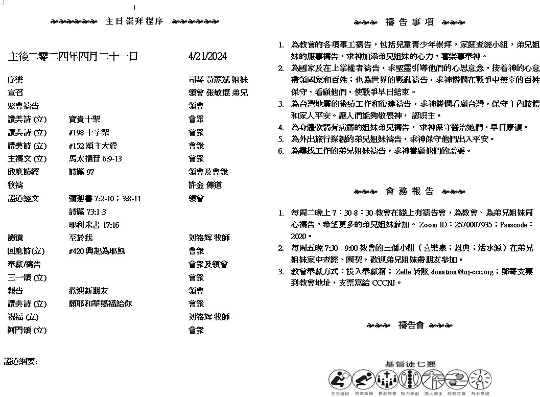 主日崇拜 10:00AM - 11:25 AM  ; 主日学 11:30AM - 12:30PM 青少年 10:00AM - 12:00PM ; 午餐 12:30M - 1:30PM 疫情時期教會的聚會实体和ZOOM网上同步举行, 歡迎新老朋友参加! https://zoom.us/j/2570007935 至於我, 我要仰望耶和華, 要等候那救我的 神, 我的 神必應允我。我的仇敵啊, 不要向我誇耀。我雖跌倒, 卻要起來;我雖坐在黑暗里, 耶和華卻作我的光。 ( 彌迦書7:7-8 )