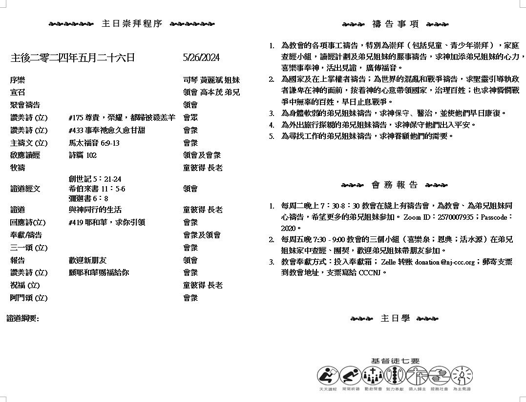 主日崇拜 10:00AM - 11:25 AM  ; 主日学 11:30AM - 12:30PM 青少年 10:00AM - 12:00PM ; 午餐 12:30M - 1:30PM 疫情時期教會的聚會实体和ZOOM网上同步举行, 歡迎新老朋友参加! https://zoom.us/j/2570007935 世 人 哪 、 耶 和 華 已 指 示 你 何 為 善 。 他 向 你 所 要 的 是 甚 麼 呢 。 只 要 你 行 公 義 、 好 憐 憫 、 存 謙 卑 的 心 、 與 你 的 神 同 行 。 ( 彌 迦 書6:8 )