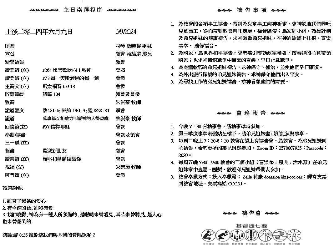 主日崇拜 10:00AM - 11:25 AM  ; 主日学 11:30AM - 12:30PM 青少年 10:00AM - 12:00PM ; 午餐 12:30M - 1:30PM 疫情時期教會的聚會实体和ZOOM网上同步举行, 歡迎新老朋友参加! https://zoom.us/j/2570007935 『 神 為 愛 他 的 人 所 預 備 的 、 是 眼 睛 未 曾 看 見 、 耳 朵 未 曾 聽 見 、 人 心 也 未 曾 想 到 的 。 』 ( 哥 林 多 前 書2:9 )