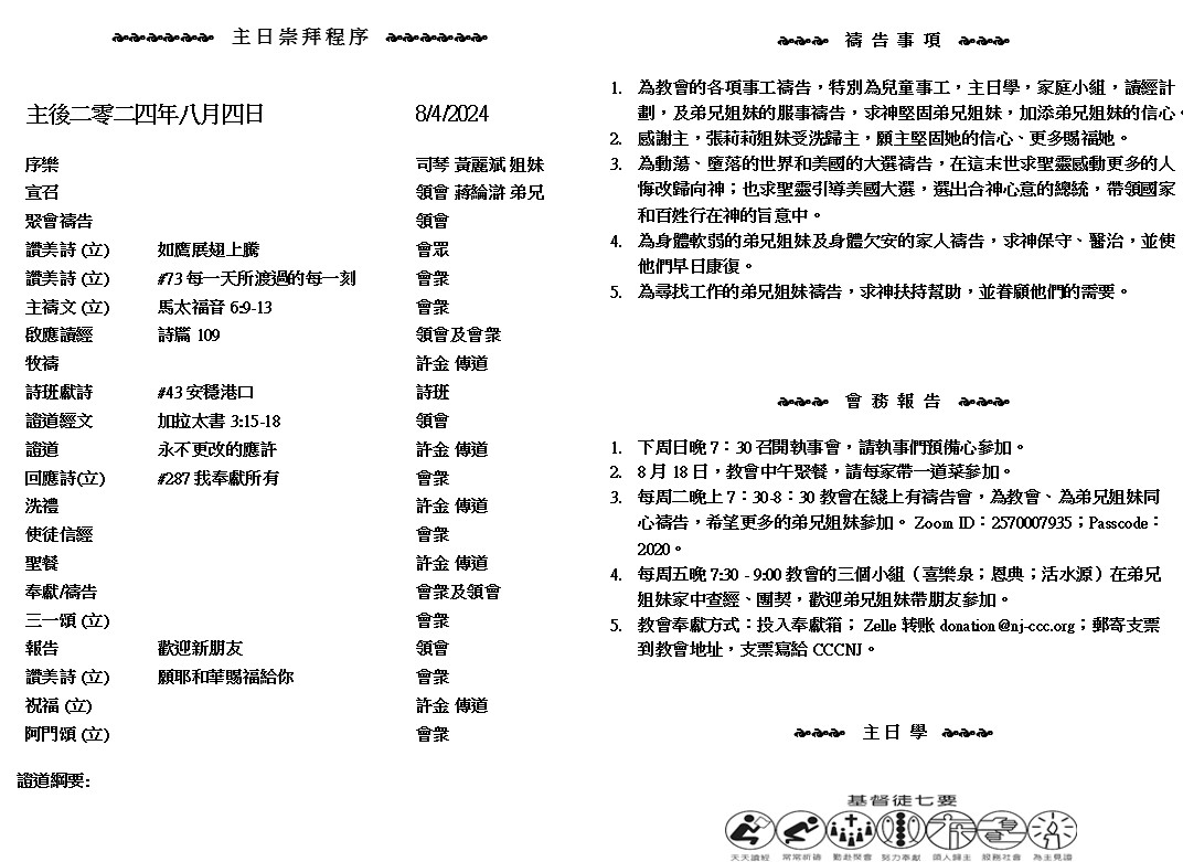 主日崇拜 10:00AM - 11:25 AM  ; 主日学 11:30AM - 12:30PM 青少年 10:00AM - 12:00PM ; 午餐 12:30M - 1:30PM 疫情時期教會的聚會实体和ZOOM网上同步举行, 歡迎新老朋友参加! https://zoom.us/j/2570007935 因 為 承 受 產 業 、 若 本 乎 律 法 、 就 不 本 乎 應 許 . 但 神 是 憑 著 應 許 、 把 產 業 賜 給 亞 伯 拉 罕 。 ( 加 拉 太 書3:18 )