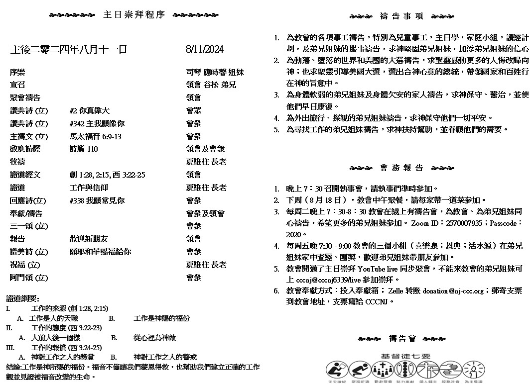 主日崇拜 10:00AM - 11:25 AM  ; 主日学 11:30AM - 12:30PM 青少年 10:00AM - 12:00PM ; 午餐 12:30M - 1:30PM 疫情時期教會的聚會实体和ZOOM网上同步举行, 歡迎新老朋友参加! https://zoom.us/j/2570007935 你 們 作 僕 人 的 、 要 凡 事 聽 從 你 們 肉 身 的 主 人 、 不 要 只 在 眼 前 事 奉 、 像 是 討 人 喜 歡 的 、 總 要 存 心 誠 實 敬 畏 主 . ( 歌 羅 西 書3:22 )