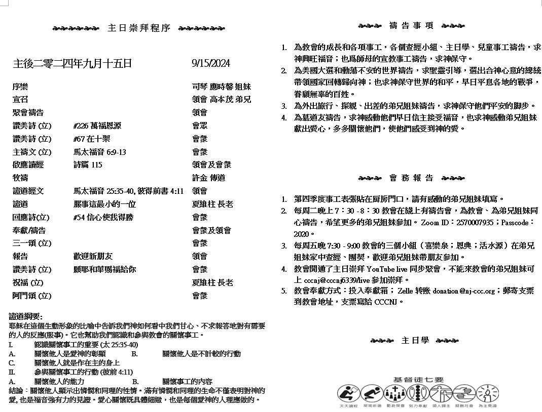 主日崇拜 10:00AM - 11:25 AM  ; 主日学 11:30AM - 12:30PM 青少年 10:00AM - 12:00PM ; 午餐 12:30M - 1:30PM 疫情時期教會的聚會实体和ZOOM网上同步举行, 歡迎新老朋友参加! https://zoom.us/j/2570007935 我 實 在 告 訴 你 們 、 這 些 事 你 們 既 作 在 我 這 弟 兄 中 一 個 最 小 的 身 上 、 就 是 作 在 我 身 上 了 。 ( 馬 太 福 音25:40 )