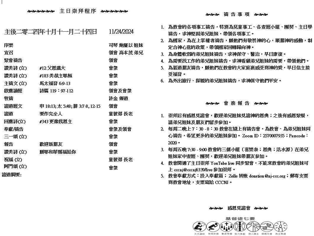 主日崇拜 10:00AM - 11:25 AM  ; 主日学 11:30AM - 12:30PM 青少年 10:00AM - 12:00PM ; 午餐 12:30M - 1:30PM 疫情時期教會的聚會实体和ZOOM网上同步举行, 歡迎新老朋友参加! https://zoom.us/j/2570007935 我 只 有 一 件 事 、 就 是 忘 記 背 後 努 力 面 前 的 、向 著 標 竿 直 跑 、 要 得 神 在 基 督 耶 穌 裡 從 上 面 召 我 來 得 的 獎 賞 。 ( 腓 立 比 書3:13-14 )