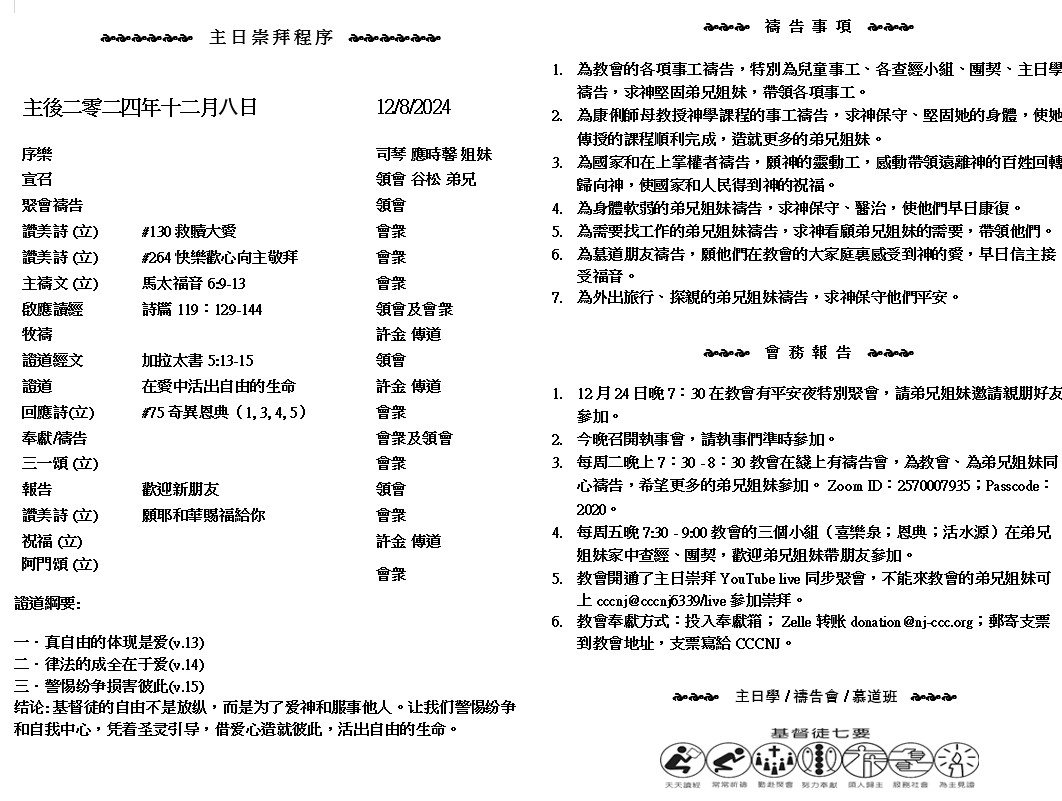 主日崇拜 10:00AM - 11:25 AM  ; 主日学 11:30AM - 12:30PM 青少年 10:00AM - 12:00PM ; 午餐 12:30M - 1:30PM 疫情時期教會的聚會实体和ZOOM网上同步举行, 歡迎新老朋友参加! https://zoom.us/j/2570007935 你 們 蒙 召 、 是 要 得 自 由 . 只 是 不 可 將 你 們 的 自 由 當 作 放 縱 情 慾 的 機 會 . 總 要 用 愛 心 互 相 服 事 。 ( 加 拉 太 書5:13 )