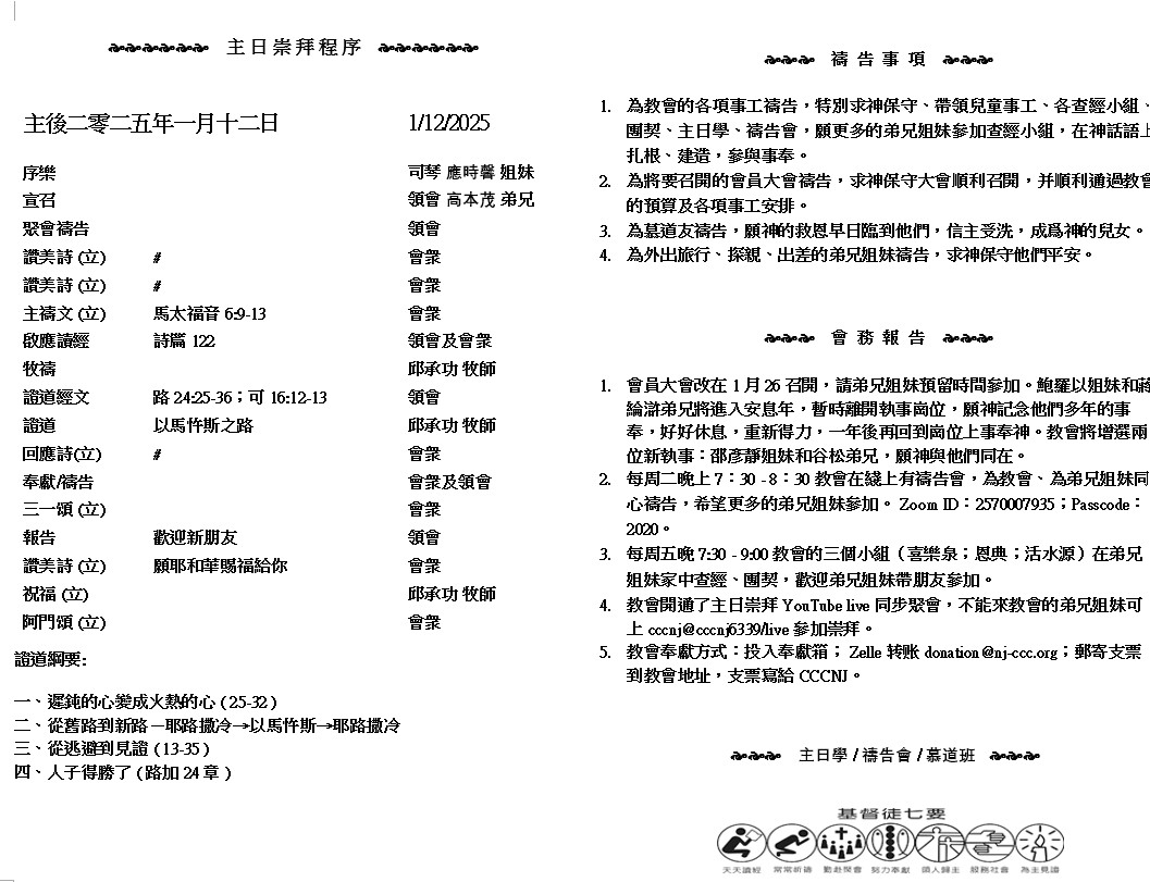 主日崇拜 10:00AM - 11:25 AM  ; 主日学 11:30AM - 12:30PM 青少年 10:00AM - 12:00PM ; 午餐 12:30M - 1:30PM 疫情時期教會的聚會实体和ZOOM网上同步举行, 歡迎新老朋友参加! https://zoom.us/j/2570007935 你 們 往 普 天 下 去 、 傳 福 音 給 萬 民 聽 。 信 而 受 洗 的 必 然 得 救 . 不 信 的 必 被 定 罪 。 ( 馬 太 福 音6:8 )