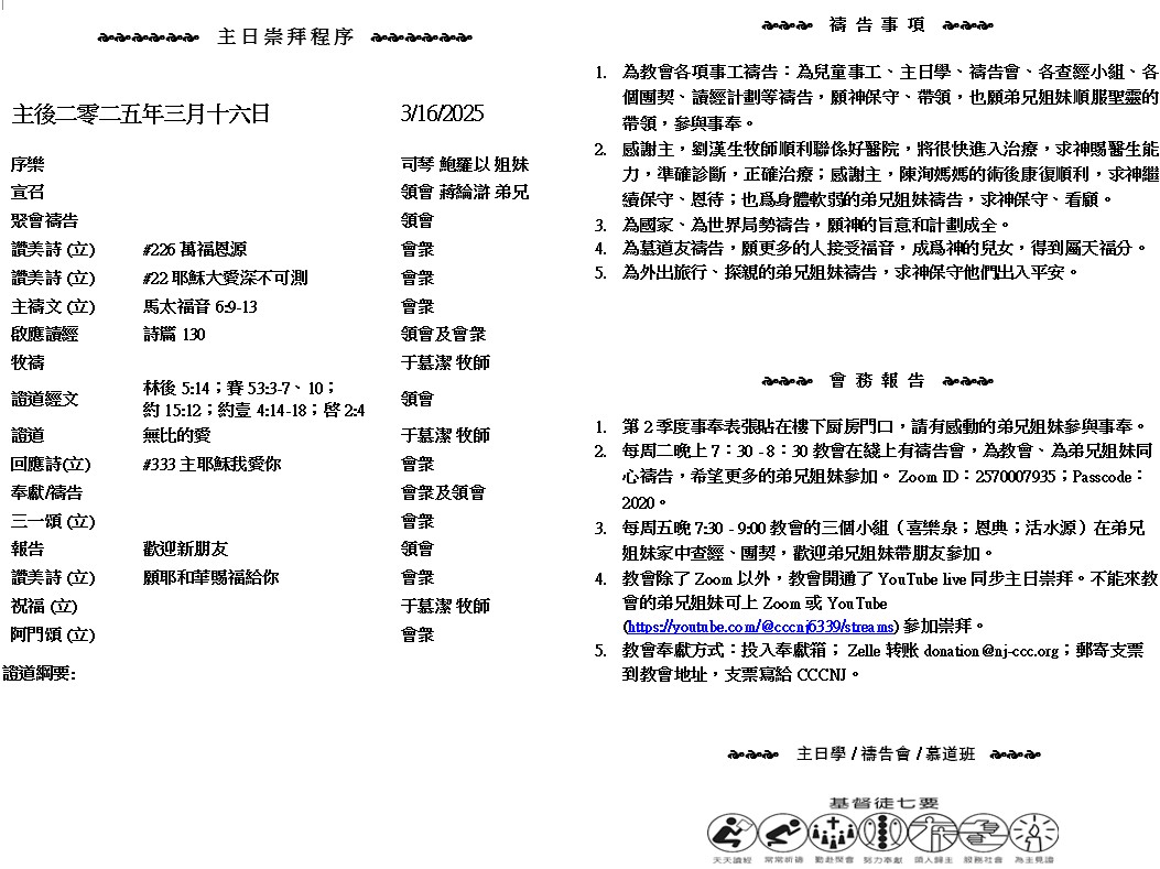 主日崇拜 10:00AM - 11:25 AM  ; 主日学 11:30AM - 12:30PM 青少年 10:00AM - 12:00PM ; 午餐 12:30M - 1:30PM 疫情時期教會的聚會实体和ZOOM网上同步举行, 歡迎新老朋友参加! https://zoom.us/j/2570007935 耶和華卻定意將他壓傷、使他受痛苦.耶和華以他為贖罪祭.他必看見後裔、並且延長年日。耶和華所喜悅的事、必在他手中亨通。 ( 尼希米記2:20 )
