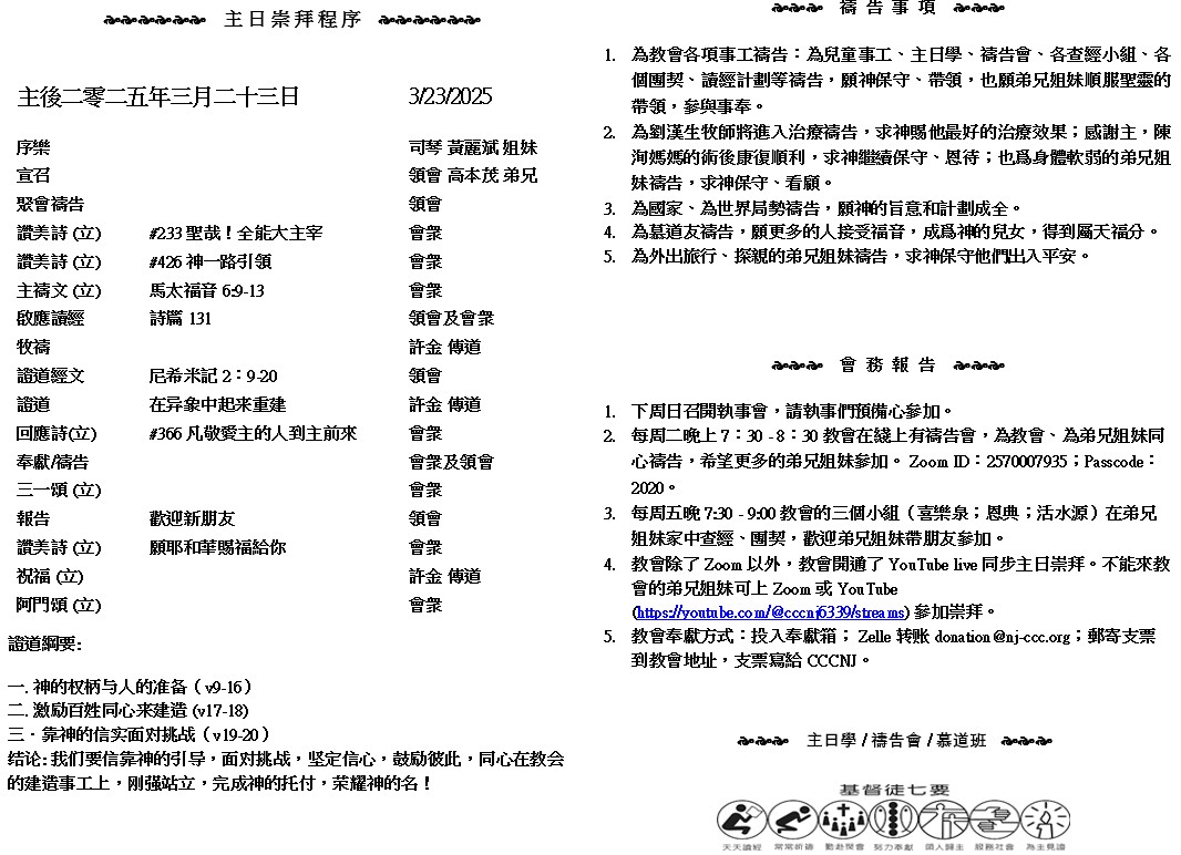 主日崇拜 10:00AM - 11:25 AM  ; 主日学 11:30AM - 12:30PM