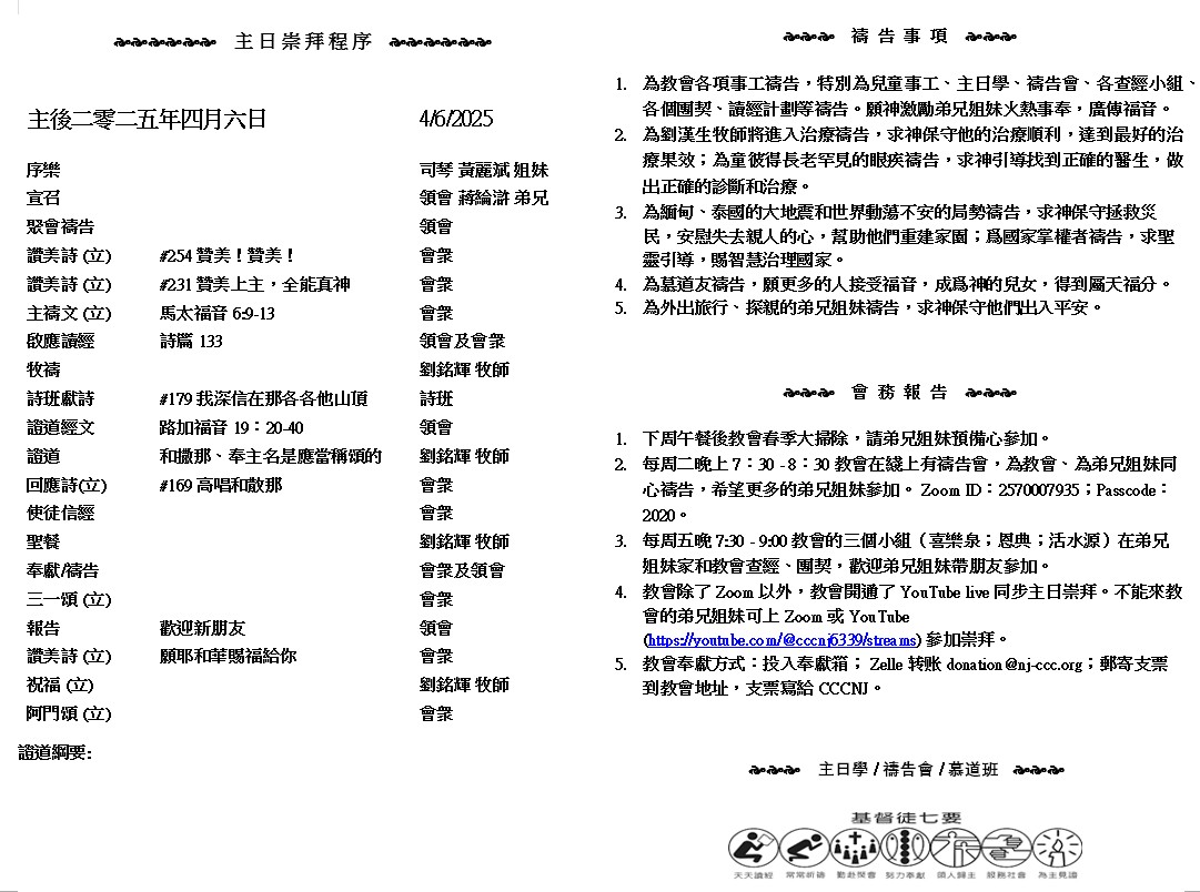 主日崇拜 10:00AM - 11:25 AM  ; 主日学 11:30AM - 12:30PM 青少年 10:00AM - 12:00PM ; 午餐 12:30M - 1:30PM 疫情時期教會的聚會实体和ZOOM网上同步举行, 歡迎新老朋友参加! https://zoom.us/j/2570007935 奉 主 名 來 的 王 、 是 應 當 稱 頌 的 . 在 天 上 有 和 平 、 在 至 高 之 處 有 榮 光 。 ( 路 加 福 音19:38 )