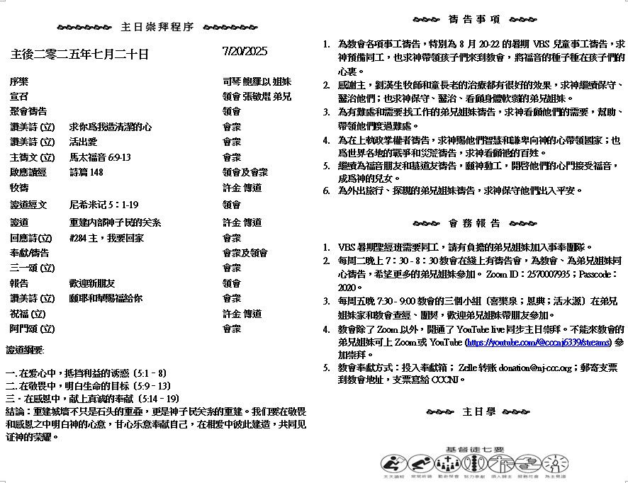 主日崇拜 10:00AM - 11:25 AM  ; 主日学 11:30AM - 12:30PM 青少年 10:00AM - 12:00PM ; 午餐 12:30M - 1:30PM 疫情時期教會的聚會实体和ZOOM网上同步举行, 歡迎新老朋友参加! https://zoom.us/j/2570007935 你們行事不當敬畏我們的 神麼.不然、難免我們的仇敵外邦人毀謗我們。 ( 尼希米記 5:9 )