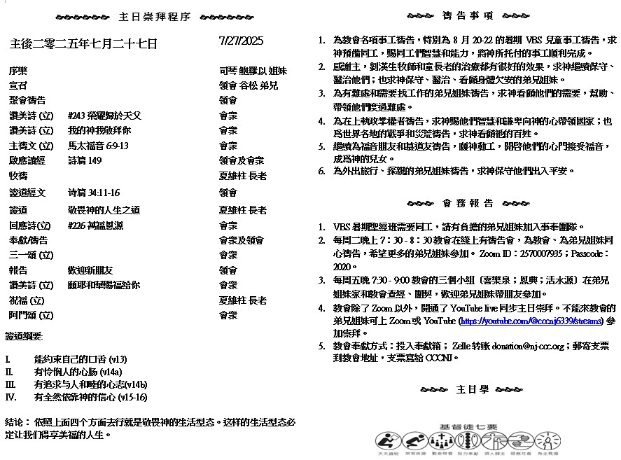 主日崇拜 10:00AM - 11:25 AM  ; 主日学 11:30AM - 12:30PM 青少年 10:00AM - 12:00PM ; 午餐 12:30M - 1:30PM 疫情時期教會的聚會实体和ZOOM网上同步举行, 歡迎新老朋友参加! https://zoom.us/j/2570007935 耶和華靠近傷心的人、拯救靈性痛悔的人。義人多有苦難.但耶和華救他脫離這一切.又保全他一身的骨頭、連一根也不折斷。 ( 詩篇 34:18-19 )