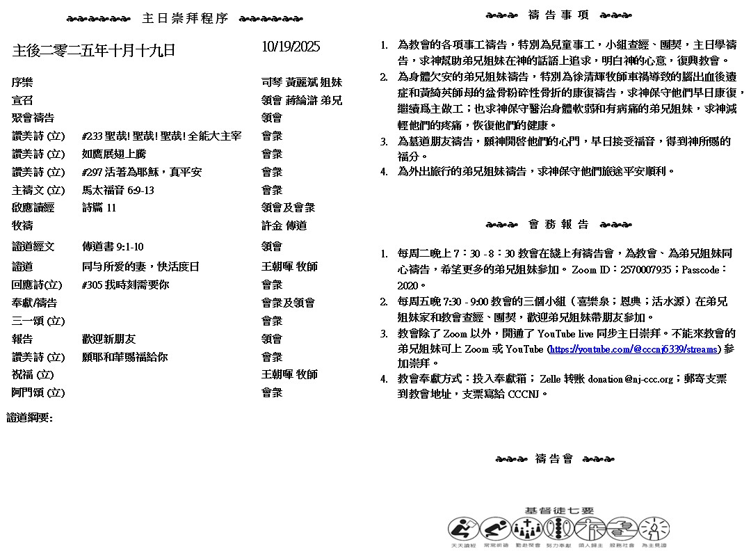主日崇拜 10:00AM - 11:25 AM  ; 主日学 11:30AM - 12:30PM 青少年 10:00AM - 12:00PM ; 午餐 12:30M - 1:30PM 疫情時期教會的聚會实体和ZOOM网上同步举行, 歡迎新老朋友参加! https://zoom.us/j/2570007935 在 你 一 生 虛 空 的 年 日 、 就 是 神 賜 你 在 日 光 之 下 虛 空 的 年 日 、 當 同 你 所 愛 的 妻 、 快 活 度 日 . 因 為 那 是 你 生 前 、 在 日 光 之 下 勞 碌 的 事 上 所 得 的 分 。 ( 傳道書9:9 )